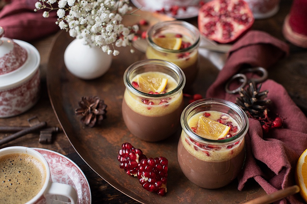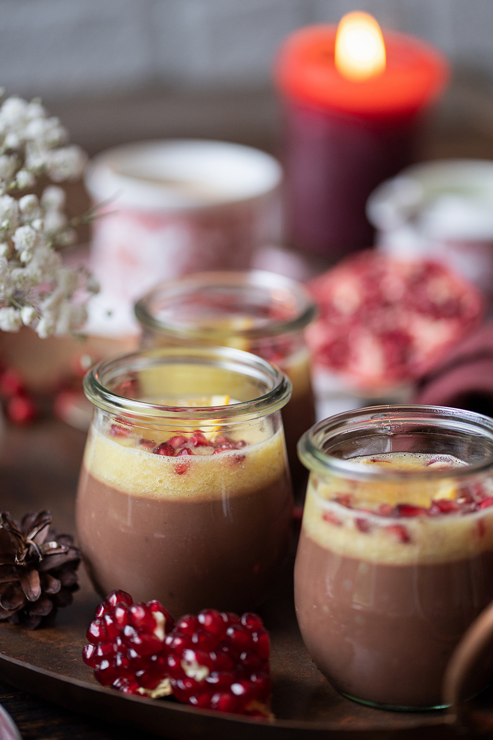 Das Orangenpüree auf der Schokoladen-Schicht in den Gläsern verteilen. Den Granatapfel auslösen und die Gläser mit Granatapfelkernen und Orangenscheiben garniert servieren.