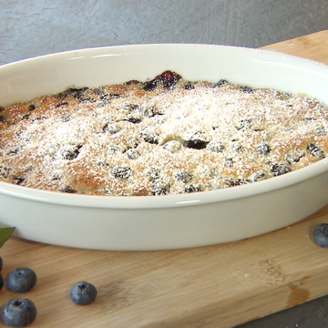 In einer großen Pfanne das Butterschmalz erhitzen und den Teig eingießen. Darauf die gezuckerten Schwarzbeeren geben.
