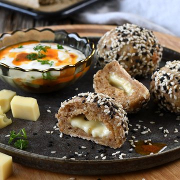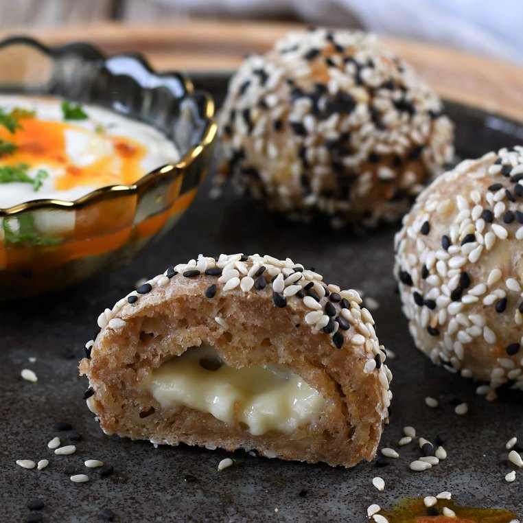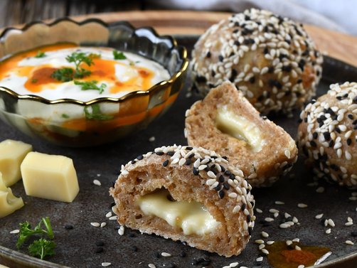 Teigstück flach drücken und eine Käsestück mit Teig einhüllen. Bällchen formen und in Sesam wälzen.