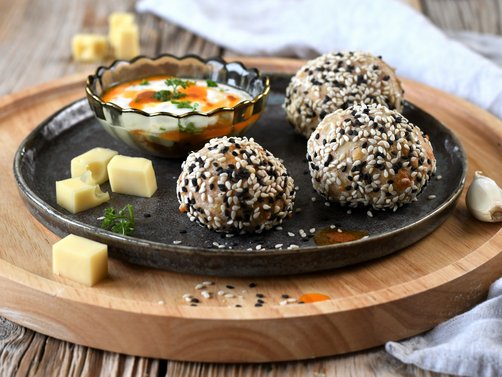 Bällchen mit Sauerrahm-Dip servieren.