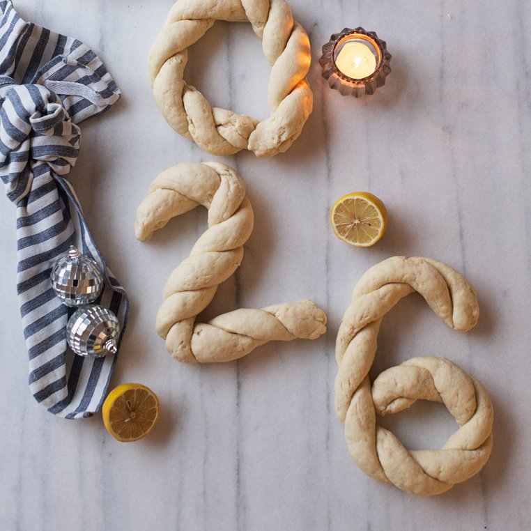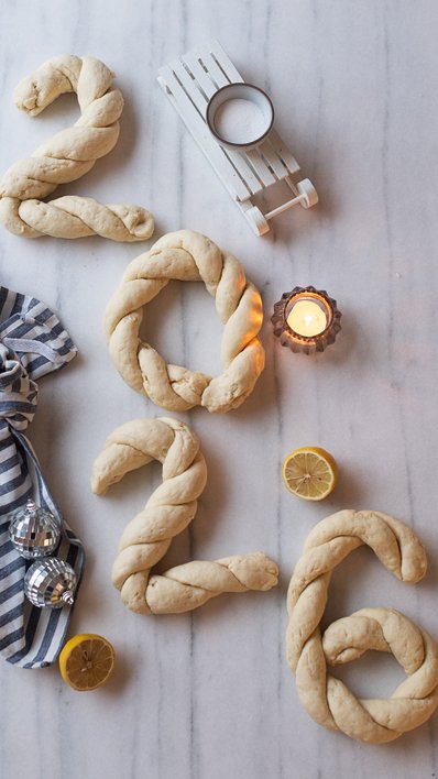 Die Teiglinge zu Strängen formen und jeweils zwei miteinander verflechten und zu einer Zahl formen.