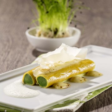 Nudelteig dünn ausrollen ca. 15cm breit und 30cm lang.