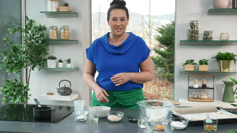 Topfen, Staubzucker, Maisstärke, Eidotter, Vanillezucker und Zitronenschale mit einem Kochlöffel verrühren. Zuletzt vorsichtig zerlassene Butter unterheben.