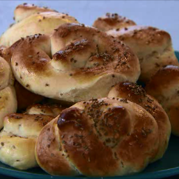 Diese Brezeln auf ein mit Backpapier ausgelegtes Backblech legen, mit Dotter bestreichen und mit ein paar übrigen Anissamen bestreuen.