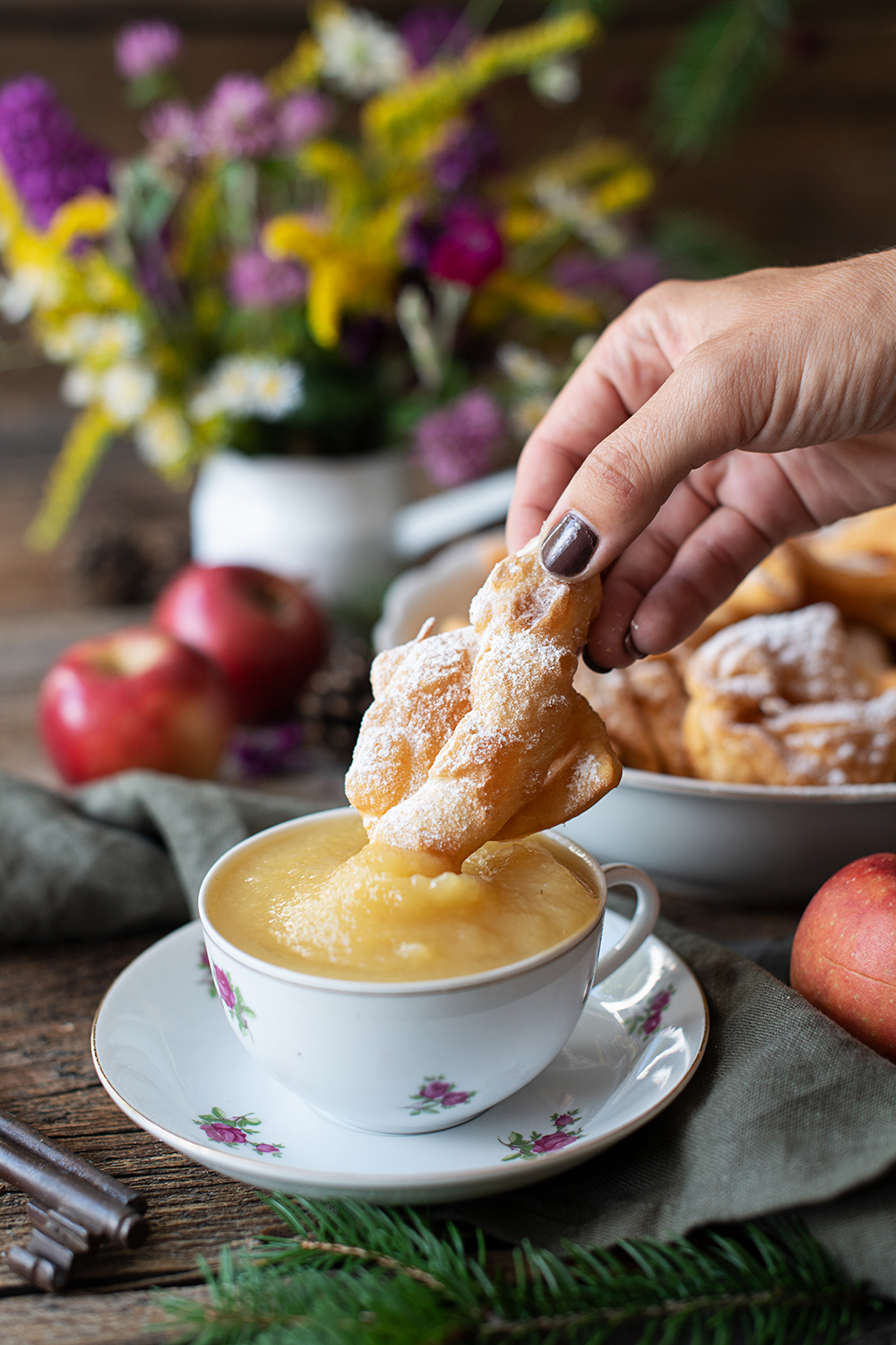 Die Tennengauer Krapfen mit reichlich Staubzucker und Apfelmus servieren.