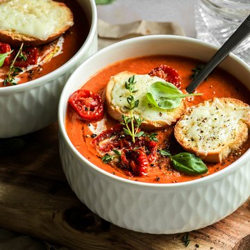 Wer möchte, kann ein paar halbierte Cocktailtomaten mitrösten und die Suppe beim Servieren damit toppen.