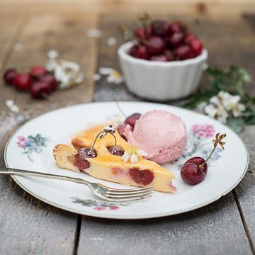 Den Auflauf im vorgeheizten Backofen bei 180 Grad Heißluft für rund 35 Minuten backen. Mit reichlich Staubzucker bestreuen und mit einer Kugel Joghurt-Kirsch-Eis servieren.