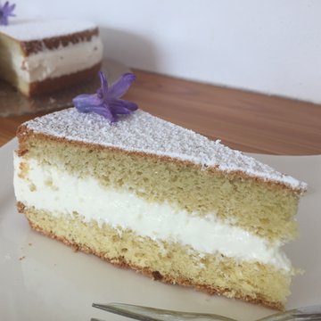 Die gut ausgekühlte Torte auseinanderschneiden.