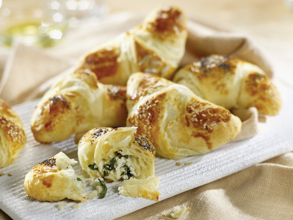 Den Blätterteig aufrollen, in 12 Dreiecke schneiden und die Spinat-Topfenfüllung auf die Blätterteigdreiecke verteilen.