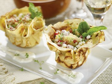 Im heißen Zustand die Palatschinken über eine Form stülpen, mit einer Schnur umwickeln und im Rohr bei geringer Hitze (100 °C) antrocknen lassen. Danach auskühlen lassen, die Schnur entfernen, von der Form heben und füllen.