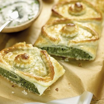 Spinat auftauen, sehr gut ausdrücken, mit Topfen vermischen und mit Salz, Pfeffer sowie zerdrücktem Knoblauch würzen.