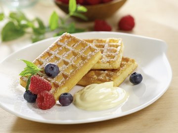 Jetzt das Waffeleisen vorheizen. Dann mit Öl oder Butter einpinseln und die Waffeln goldgelb backen.