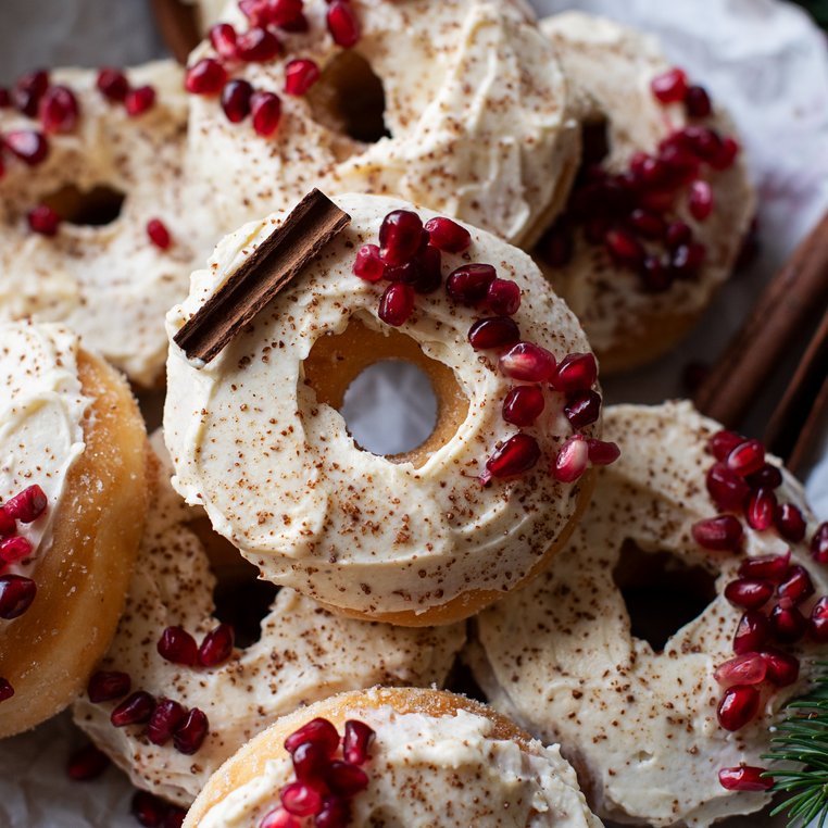 Für das Frosting alle Zutaten glattrühren. Die Donuts kurz vor dem Servieren mit den Frosting bestreichen und mit Granatapfelkernen garnieren.