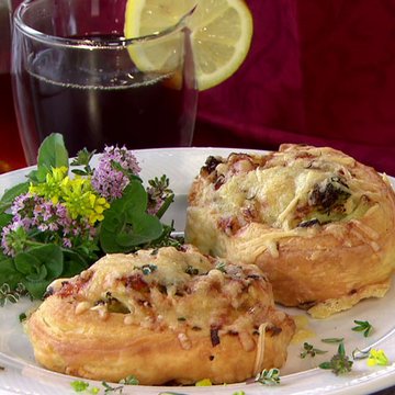 Einrollen, ca. 2 bis 3 cm dicke Scheiben abschneiden, mit Käse bestreuen und auf einem Backblech ca. 15 Mintuen bei 200 Grad backen.