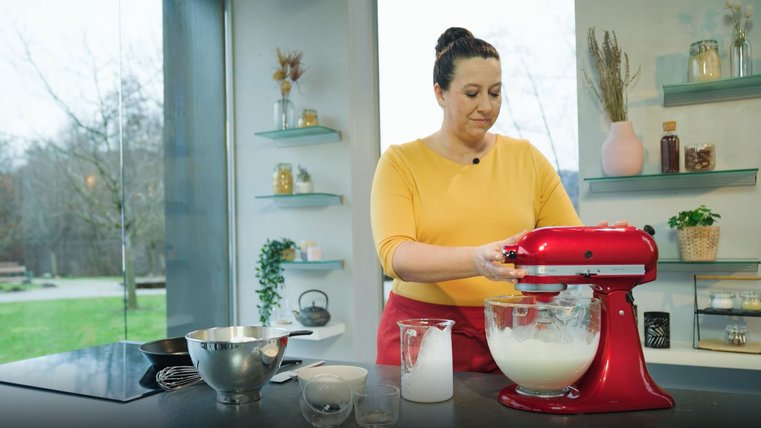 Maisstärke und Mehl abwechselnd mit dem steif geschlagenen Schnee untermischen.