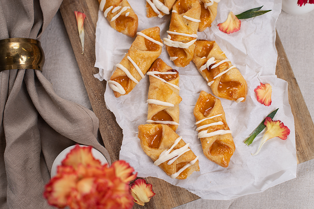 Anschließend je zwei diagonale Ecken übereinanderschlagen. Zum besseren Verkleben mit verquirltem Ei bestreichen.
