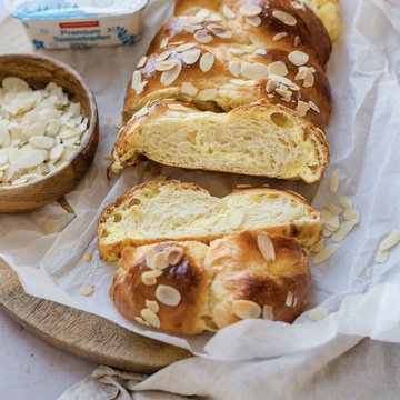 Danach kurz aus dem Rohr nehmen, mit einem verquirlten Ei bestreichen und mit Mandelblättchen bestreuen.