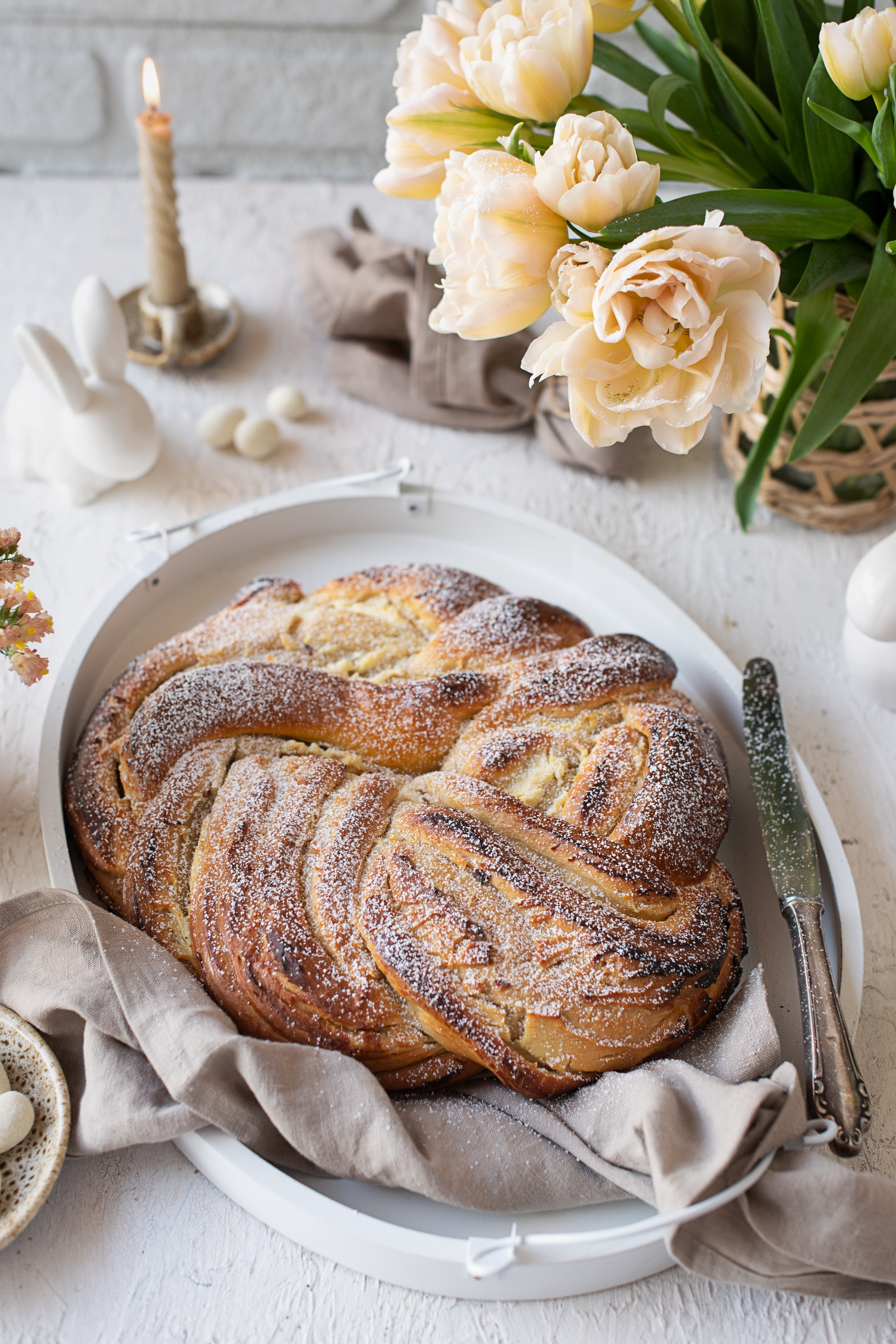 Den Striezel-Kranz optional nochmals 20 Minuten rasten lassen. Mit Eigelb bestreichen und im vorgeheizten Backofen bei 180 °C Heißluft für 30 Minuten backen.