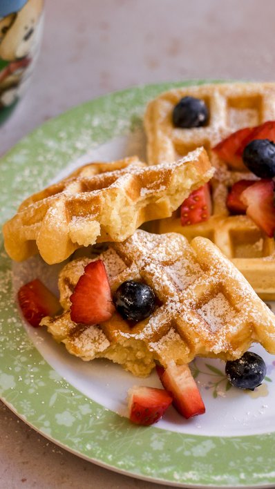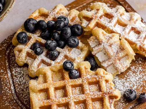Die Topfenwaffeln am besten warm mit Staubzucker und frischen Beeren servieren.