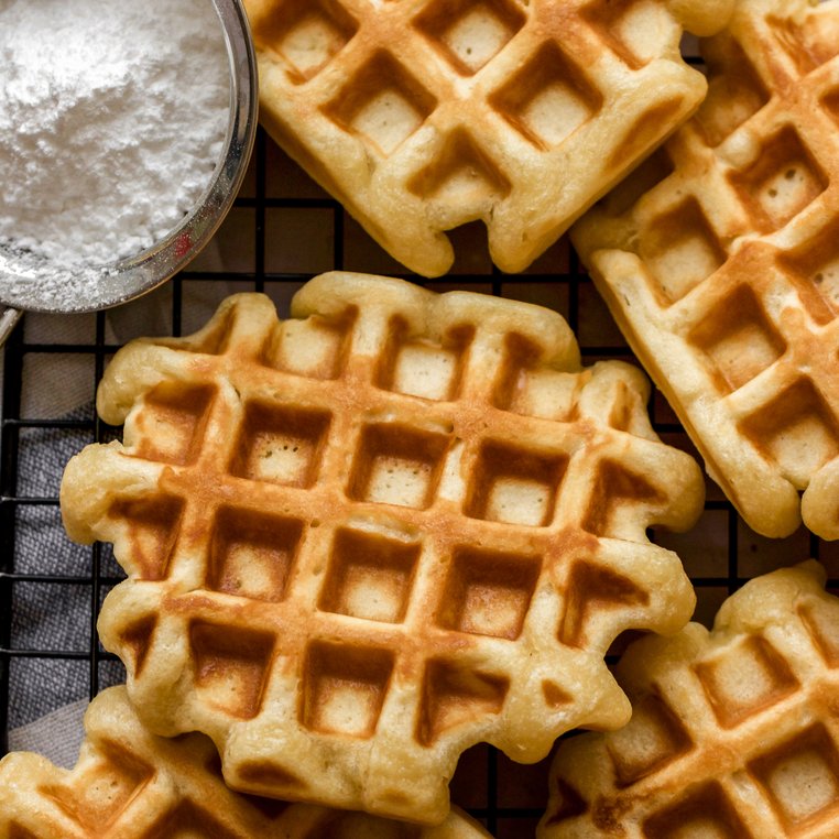 Ca. ½ TL Butter pro Waffel in die Mitte der Waffelform streichen. Einen großen Esslöffel voll Teig darauf geben. Die Waffeln backen, bis sie goldbraun sind.
