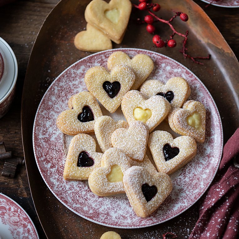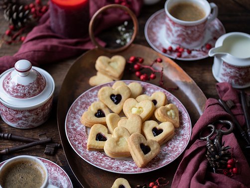 Den Teig auf einer bemehlten Arbeitsfläche dünn ausrollen und Herz-Kekse ausstechen. Aus der Hälfte der Kekse ein kleines Herz in der Mitte ausstechen.