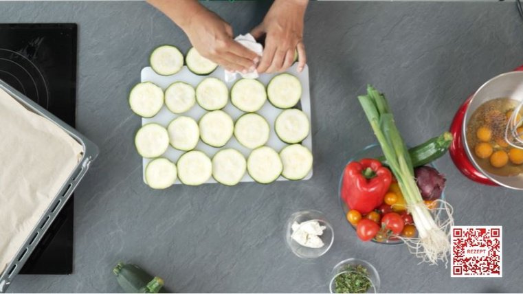 Zucchini in dünne Scheiben schneiden, leicht salzen und 10 Minuten stehen lassen. Die überschüssige Flüssigkeit dann mit einem Küchentuch aufsaugen.