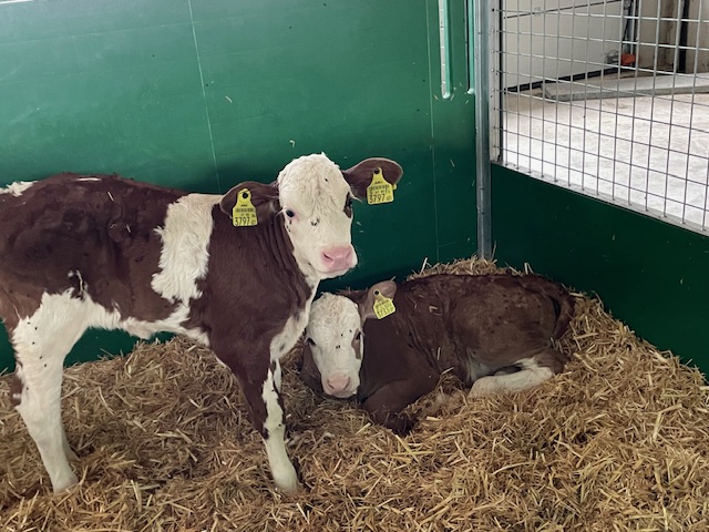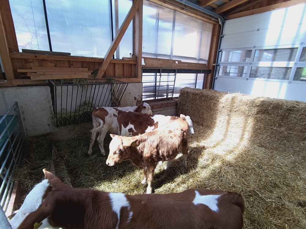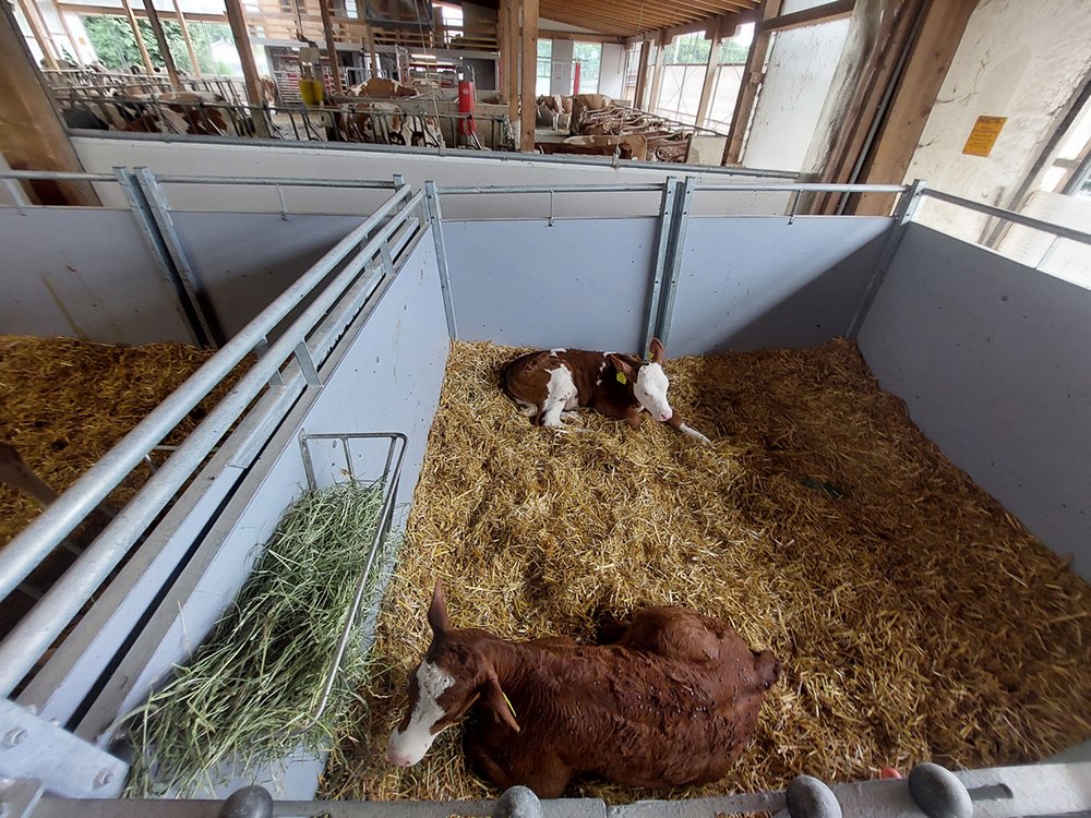 Unsere Kälber bekommen schon immer in den ersten Lebensstunden 3 bis 4 Liter hochwertiges Kolostrum, also Biestmilch – das ist für uns selbstverständlich. Danach werden sie mit angesäuerter Vollmilch ad libitum über das Milchtaxi getränkt. Frisches Wasser, Bio-Kälbermüsli in Aluschüsseln, bestes Heu und ein Salzstein stehen jederzeit zur Verfügung. Dank des neuen Kälberstalles, in dem man vor Wind und Wetter geschützt ist, ist es eine Freude, den Kälbern all das bieten zu können.