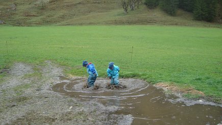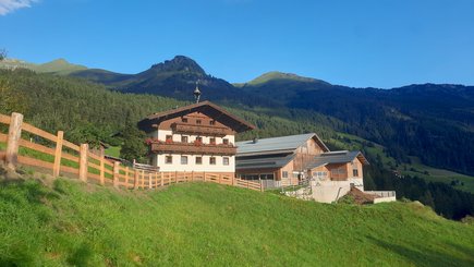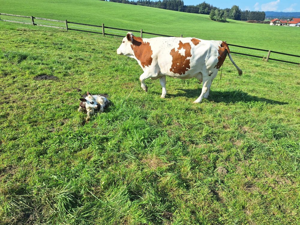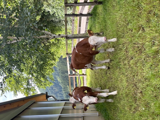 Unsere Kühe kalben in der Herde und bleiben die ersten 24 Stunden bei der Mutter. Danach kommen sie in eine Kälberbox direkt hinter dem Melkstand – so bleiben Sicht- und Schnupperkontakt erhalten. In den ersten drei Wochen gibt es frische Vollmilch, so viel sie möchten. Anschließend kommen die Kälber in Gruppenhaltung mit Auslauf und Sozialkontakt zu älteren Tieren. Unsere Jungrinder und Kühe verbringen von April bis Oktober die meiste Zeit auf Weiden, unserer eigenen Alm und der Hochalm. Dort genießen sie frisches Gras, viel Bewegungsfreiheit und die klare Bergluft.