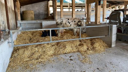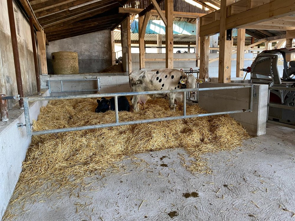 Unseren Tieren stehen nun 20 Hektar Weide zur Verfügung, 7 Hektar haben wir mit massiven Holzzäunen eingezäunt, wodurch die Kälber nach der Geburt anfangs bei der Mutter bleiben und trinken können. Während der Vegetation kalben alle Kühe auf der Weide – ruhig, stressfrei und unter natürlichen Bedingungen. Durch die ständige Weidehaltung der Trockensteher mit viel Bewegung gibt es bei uns seit Jahren keine Schwergeburten mehr. Auch das Weiden von mehreren Tiergruppen nebeneinander ist möglich, ohne dass umgestellte Tiere zur alten Gruppe durchbrechen können, wie es zuvor mit einfachem Stromweidezaun und temperamentvollen Tieren passierte. Weitere Maßnahmen wie Tiefstroh-Liegeboxen, Weidehaltung für Jungvieh, manuelle Stroheinstreu von oben und strukturierte Gruppenhaltung runden unser Tierwohlkonzept ab und machen es arbeitswirtschaftlich sinnvoll und zukunftsfähig.