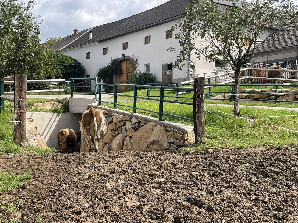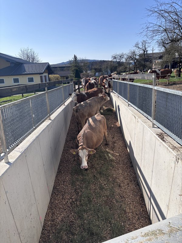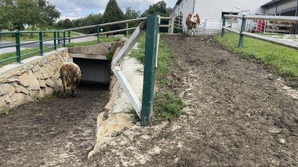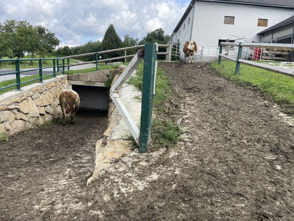 Unsere gesamte Weidefläche liegt auf der anderen Seite einer mittelstark befahrenen Straße. Früher haben wir die Herde zu fixen Zeiten über die Straße getrieben und später wieder zurück in den Stall. Das war zeitintensiv, mühsam und mit Risiken verbunden – für uns, für die Kühe und für die Verkehrsteilnehmer. Mit der Unterführung unter der Straße haben wir diese Herausforderung nachhaltig gelöst. Die Kühe können nun selbstständig, sicher und ohne Stress auf die Weide gehen. Ergänzt wird das System durch ein automatisches Selektionstor, das mit dem Melkroboter kommuniziert und die Tiere je nach Melkstatus in den Stall oder auf die Weide leitet.