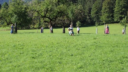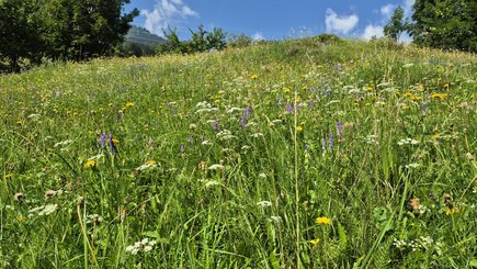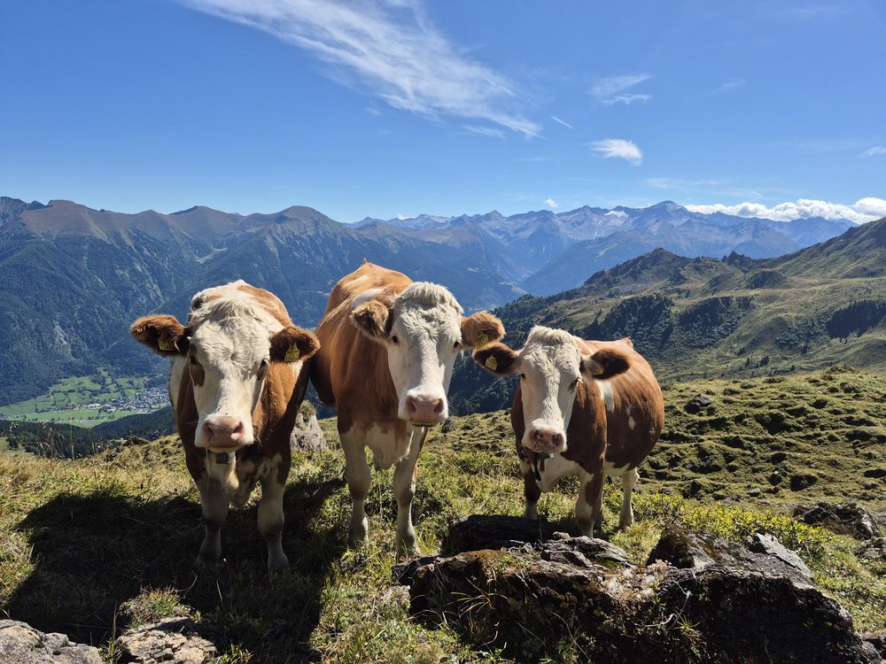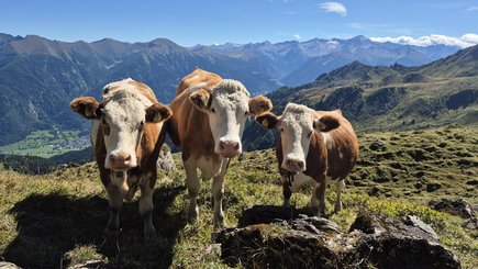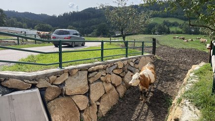 Unsere Wälder forsten wir klimafit mit verschiedenen Baumarten auf – allein 2024 haben wir 1.500 Bäume gepflanzt. Umliegende Felsformationen, Feldgehölze und Nistplätze im Stall schaffen zusätzliche Lebensräume für zahlreiche Tierarten. Unsere Jungrinder und Kühe verbringen von Mai bis Oktober die Zeit auf unserer eigenen Alm und einer Gemeinschaftshochalm, wo sie Bewegungsfreiheit und frische Bergluft genießen können. Die bewirtschafteten Almen spielen für die Biodiversität zudem eine wichtige Rolle.