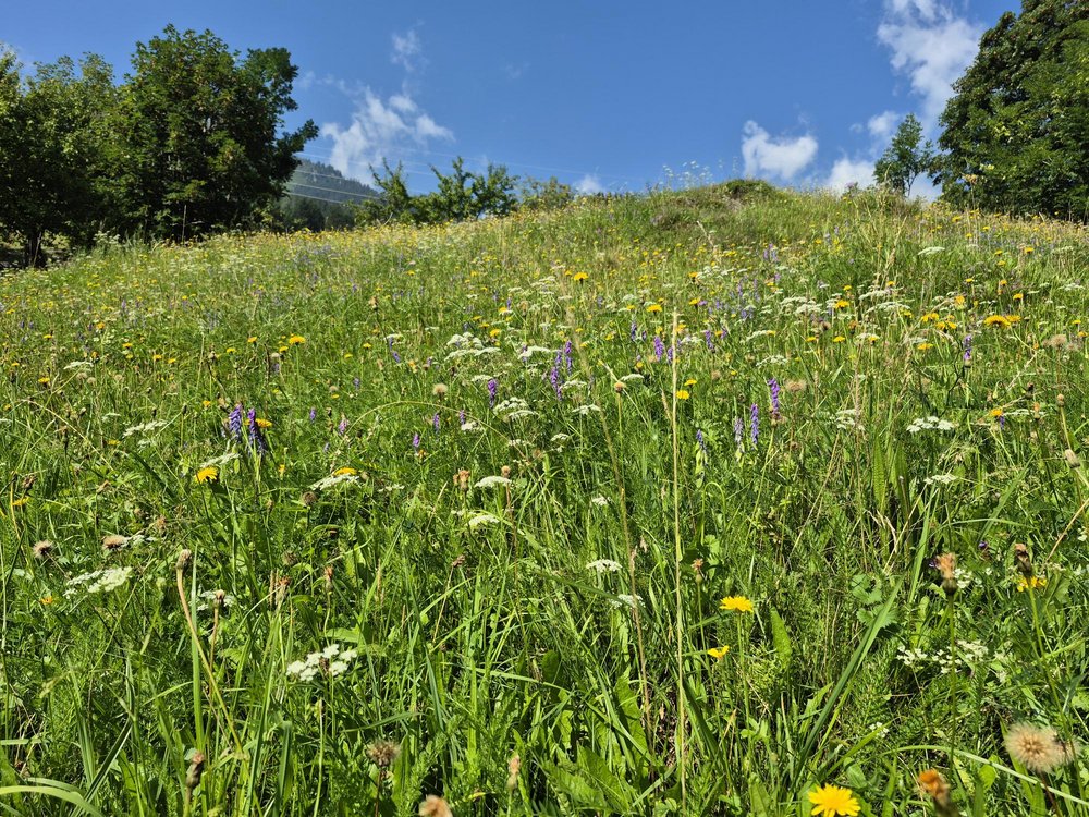 Unser Hof ist bewusst als vielfältiger Lebensraum gestaltet – mit Streuobstwiesen, Biotopen, Kräuterbeeten, Steinhaufen, Hecken und artenreichen Wiesen. Durch extensive Weidehaltung, abgestuften Wiesenbau und überwiegende Heufütterung im Winter fördern wir gezielt die Biodiversität und reduzieren gleichzeitig Transportwege durch betriebseigenes Futter. Baumgruppen, Wälder und eine eigene Naturschutzfläche bieten Schutz und Rückzugsräume für eine Vielzahl an Tieren und Pflanzen.