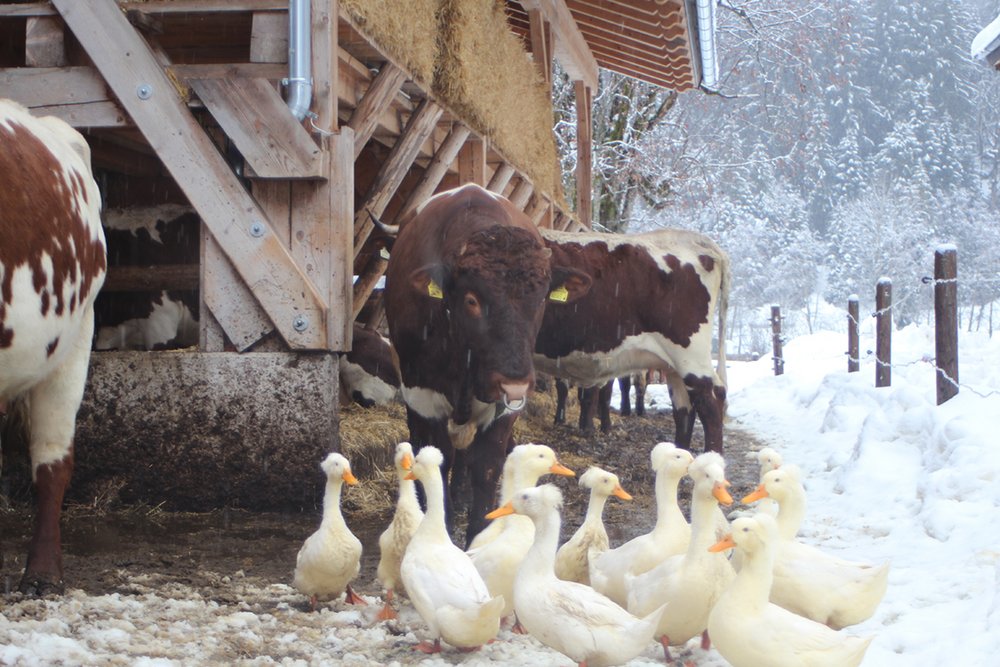 Wenn man auf eurem Hof ankommt, meint man auf der Arche Noah gelandet zu sein. Hier gibt es Schweine, Ziegen, Hühner, Ponys, Pfaue, Katzen, Hasen und Original Pinzgauer Rinder und sogar Bio-Bienen. Und sogar österreichische Landenten mit und ohne Haube! Außerdem habt ihr euch ganz bewusst für eine besonders nachhaltige Bewirtschaftungsform entschieden und betreibt euren Hof seit 1993 biologisch. Ihr habt also immer viel zu tun!