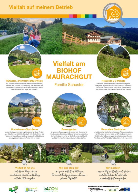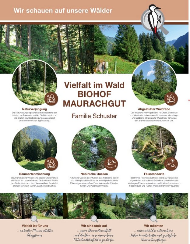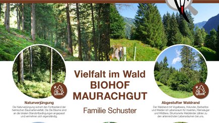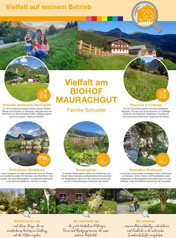 Wir möchten ein inspirierender österreichischer Landwirtschaftsbetrieb sein, der Nachhaltigkeit auf allen Ebenen vorlebt: in der Tierhaltung, der Landbewirtschaftung, der Energieversorgung, der sozialen Verantwortung und im täglichen Leben. Als Urlaub am Bauernhofbetrieb und Green Care Auszeithof schaffen wir am Maurachgut Raum für Erholung, Lernen und echte Begegnungen. Denn wir sind überzeugt: Nur was man kennt, kann man schützen – und nur was man mit Liebe macht, bleibt. Daher haben wir zur Wissensvermittlung zahlreiche Informationstafeln über Tierarten und das Leben am Bauernhof am gesamten Hofgelände montiert.