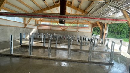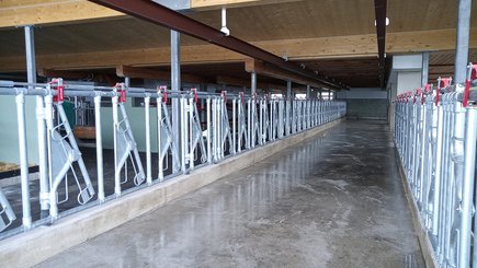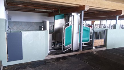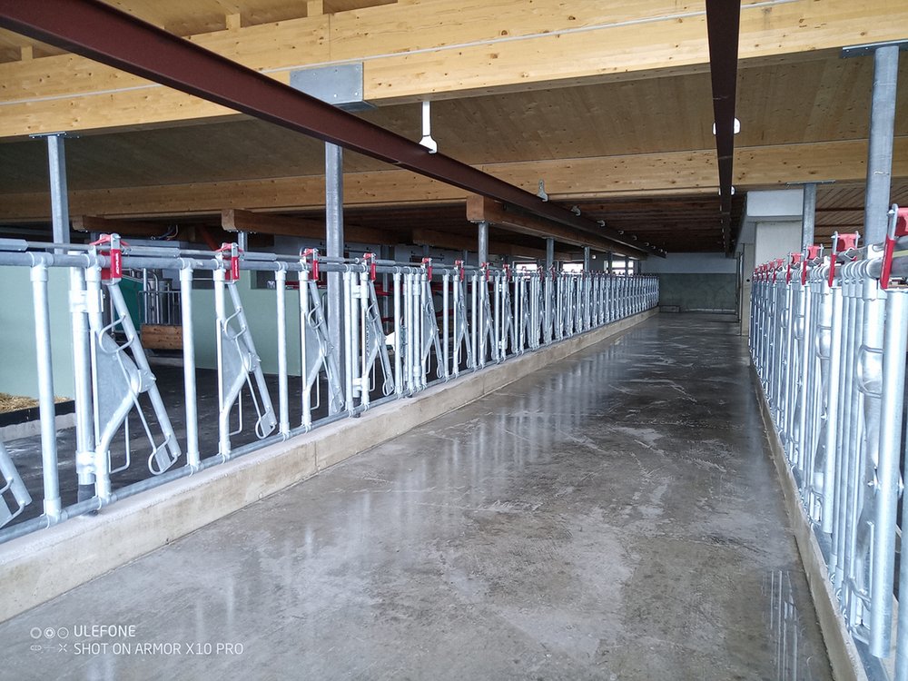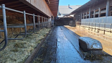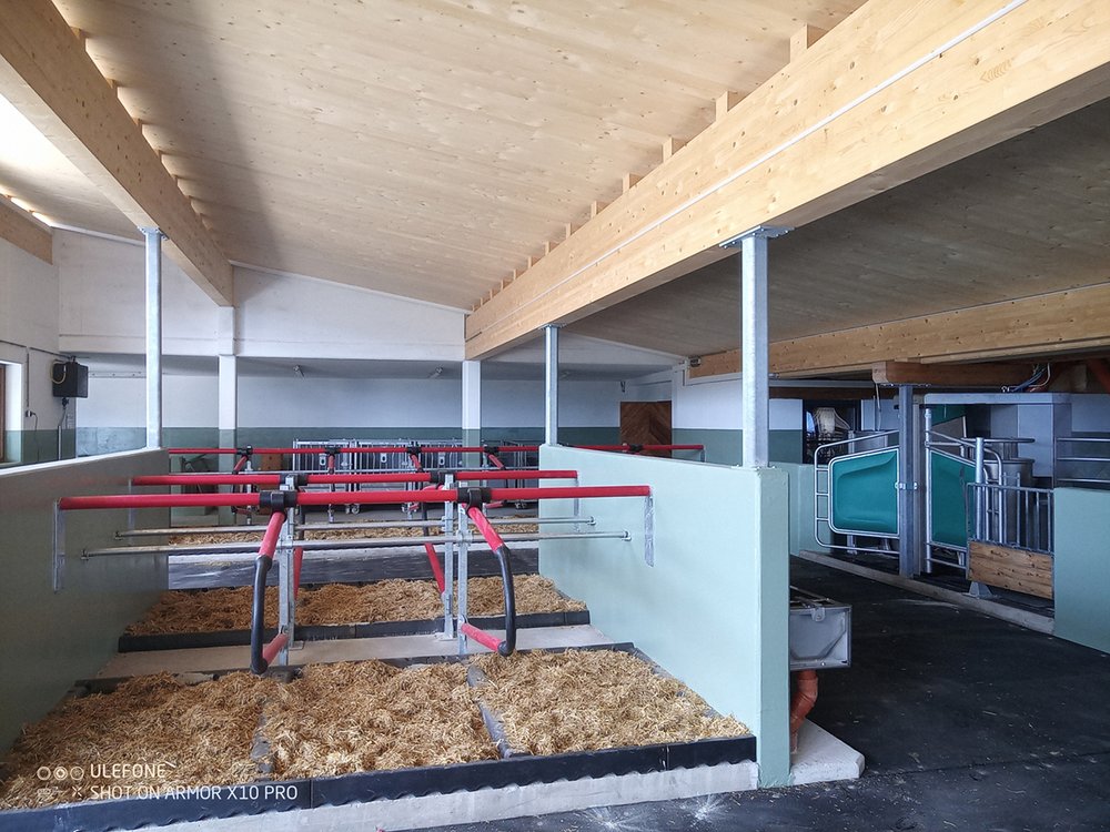 Im Altgebäude wurde eine großzügige Abkalbe- und Krankenbox mit Sägespänen eingerichtet. Im ehemaligen Jungviehstall befindet sich nun ein Kippstand zur Klauenpflege, lahme Kühe werden direkt vom Roboter selektiert und werden sofort behandelt. Zusätzlich wurde ein 5 Meter breiter, planbefestigter Laufgang mit Liegeboxen integriert, der mehrmals täglich gereinigt wird und durch ein Rautenmuster gute Laufbedingungen bietet. Für alle Kühe gibt es mit einem Kalk-Stroh-Gemisch eingestreut “Doro-Zimmermann-Liegeboxen”, in denen sie bequem aufstehen können.
