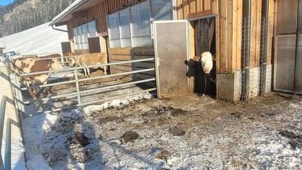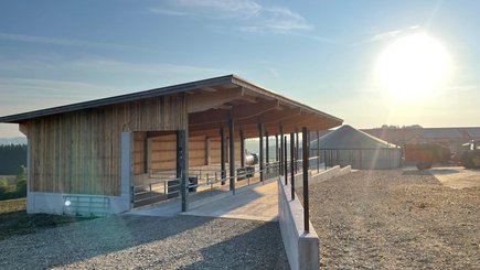 Davor waren die Kalbinnen in mehreren Abteilen und an verschiedenen Orten am Betrieb aufgeteilt, das Füttern und Einstreuen war arbeitsintensiv, oft mussten wir die Tiere umstallen. Um Baukosten zu sparen, haben wir die Hülle des alten Jungviehstalles genutzt. Wir haben dann einen überdachten Futtertisch und auch überdachte Liegeboxen gebaut, alles andere ist eigentlich ein planbefestigter Auslauf. Die Kühe passen ihr Verhalten an die jeweilige Wetterlage an, wenn es etwa sehr heiß ist und ein Gewitter kommt, suchen sie das Freie und kühlen sich gerne im Regen ab. Bei Starkregen oder niedrigen Temperaturen gehen die Kühe aber auch gerne wieder ins Trockene. Um die Tiere vor kaltem Ostwind zu schützen, haben wir ein Windschutznetz angebracht, das im Frühling aufgerollt wird.