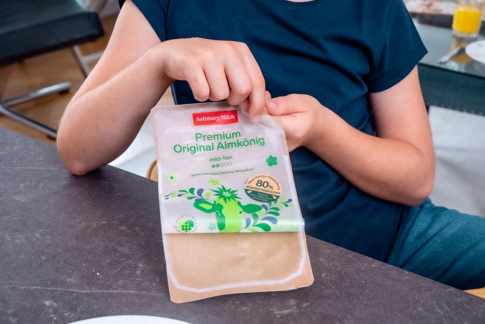 Bereits seit Beginn des Jahres werden für die Scheiben der SalzburgMilch Premium Käsesorten Almkönig, Gouda, Emmentaler und Bergkäse neue Kartonschalen anstatt der zuvor üblichen reinen Kunststoff-Verpackungen verwendet. Mit diesem großen Schritt konnten bereits 80% Kunststoff gegenüber einer herkömmlichen Kunststoff-Schale eingespart werden. Jetzt geht SalzburgMilch noch einen Schritt weiter. Denn ab sofort ist dieser Karton zu 100% als Altpapier verwertbar. Die dünne Folie, mit welcher der Karton aus Qualitätsgründen beschichtet werden muss, lässt sich – gemeinsam mit der Deckfolie der Verpackung - kinderleicht vom Karton trennen und kann getrennt gesammelt und der Wertstoffsammlung zugeführt werden. In diesem kurzen Video zeigen wir, wie einfach das geht.