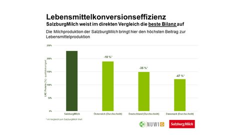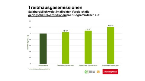 Zusammengefasst lässt sich sagen, dass die Salzburger Landwirtschaft sehr nachhaltig ist. Im internationalen Vergleich fallen die Treibhausgasemissionen der Milcherzeugung der SalzburgMilch mit knapp 1 kg CO2-Äquivalente je Kilogramm Milch gering aus und liegen sogar ca. 5 % unter dem Österreichschnitt. Dabei erbringt die stark grünlandbasierte Wirtschaftsform der SalzburgMilch Betriebe viele wichtige Ökosystemleistungen wie etwa die Bereitstellung sauberen Trinkwassers, die Kohlenstoffspeicherung, die Förderung wertvoller Artenvielfalt verschiedenster Tier- und Pflanzenarten sowie den Erhalt eines komplexen Ökosystems und der Kulturlandschaft, die wir für Tourismus und Naherholung so schätzen.