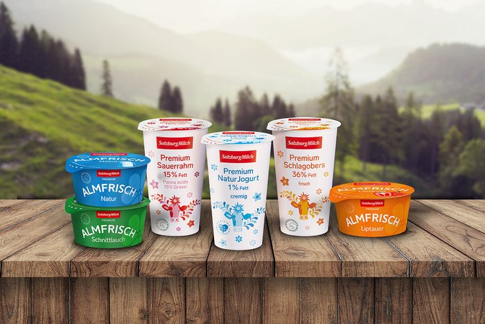 Die SalzburgMilch Jogurt- und Sauerrahmsorten bestehen, ebenso wie der Almfrisch, aus einem Kunststoffbecher, einer Papierbanderole und der so genannten Platine, einem Deckel aus Aluminium.