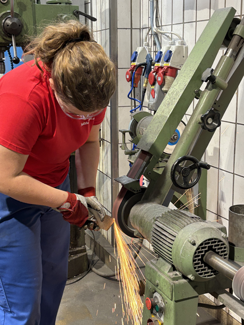 Mein Alltag ist immer sehr unterschiedlich. Manchmal gehe ich mit Arbeitskollegen zusammen auf Montage, wenn etwa einzelne Bauteile zusammengeführt werden müssen. Oft darf ich Arbeiten, die ich mir selbst zutraue, schon allein erledigen. Und manchmal bleibe ich auch einfach in der Werkstatt und lerne mal wieder etwas Neues. Wenn ich mich für Lieblingsthemen entscheiden müsste, dann wären das definitiv das Schweißen und die Pneumatik. Falls ihr euch jetzt fragt, was Pneumatik bedeutet? Das ist eigentlich ganz simpel: Pneumatik nutzt Druckluft, um Bewegung zu erzeugen und damit mechanische Arbeit zu verrichten. Nachdem ich bereits um 6:30 Uhr mit der Arbeit starte, darf ich auch schon um halb vier wieder nach Hause gehen, davor muss ich aber noch den Arbeitsplatz so sauber wie möglich verlassen, denn wer will schon an einem dreckigen Arbeitsplatz arbeiten!