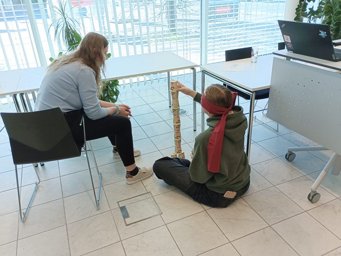 Bevor es richtig losgehen konnte, haben uns unsere Betreuer mit spannenden Theorieeinheiten und kniffligen Aufgaben auf das Thema eingestimmt. Dabei ging es nicht nur ums Zuhören, sondern auch ums Mitmachen bei den Spielen, die uns direkt gefordert haben. Eine Aufgabe war es zum Beispiel, mit leeren Joghurtbechern einen möglichst hohen Turm zu bauen. Ihr fragt euch jetzt bestimmt, inwiefern das eine Challenge sein soll? Der Haken? – wir mussten die Becher blind stapeln, während unser Partner uns Anweisungen gegeben hat, wo, wie und wann man die Becher ablegen muss.