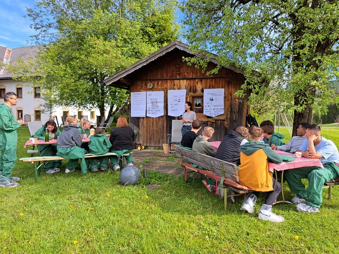 Wir wurden herzlichst begrüßt und schon beim Betreten des Hofes konnte man den großen Zusammenhalt innerhalb der Familie spüren. Bevor es los ging, hat uns die Familie ihren Alltag auf dem Hof geschildert. Neben seiner Tätigkeit als Bauer arbeitet Herr Ebner, der Vater der Familie, nämlich auch in einem regulären Job. Um den Spagat zwischen Berufsleben und Landwirtschaft zu schaffen, packt die ganze Familie tatkräftig an, also auch die Ehefrau von Herrn Ebner und seine Eltern. Nach den lebhaften Erzählungen, wie sich der Alltag am Hof gestaltet und wie die Beziehung der Bauern zu den Tieren ist, haben wir einen sehr spannenden und informativen Betriebsrundgang erhalten. Familie Ebner erklärte uns, wie viel Grund sie bewirtschaften und dass sie sich auf ihrem Hof für die Bio-Haltung entschieden haben. Unsere Tierärztin, Dr. Katharina Lichtmannsperger, die uns an diesem Tag zum Hof begleitet hat, klärte uns dann noch über unterschiedliche Haltungsformen in Österreich auf, diese reichen vom Laufstall über die Kombinationshaltung, den Auslaufstall, die Weidehaltung bis hin zur Bio-Haltung, wie sie von Familie Ebner praktiziert wird.
