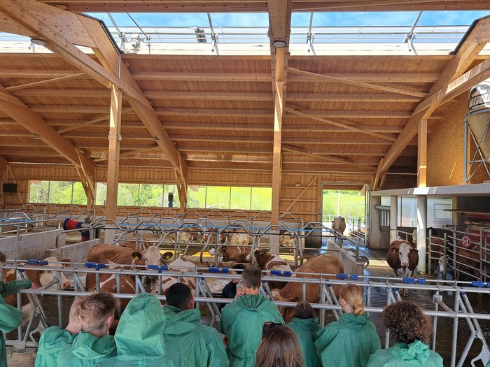 Nach der Stallführung und den ganzen verschiedenen Einblicken wurden wir von der Familie mit Kaffee und Kuchen versorgt, was wir sehr geschätzt haben. Von unserer Tierärztin haben wir eine Einschulung über den Ablauf des Melkprozesses bekommen. Hier haben wir erfahren, wie oft eine Kuh am Tag gemolken wird und wie viel Milch sie dabei circa abgibt, welches Futter gesund und ungesund für die Tiere ist und wie die Milch weiterverarbeitet wird. Danach ging es nochmals in den Stall, wo wir die gerade einmal ein paar Wochen alten Kälber sehen durften. Wir haben erfahren, dass Kälber kurz nachdem sie zur Welt gekommen sind, zweimal täglich mit einer Flasche gefüttert werden. Auch die Gesundheitschecks bei den Kälbern sind sehr genau, denn gesunde Kälber sind die Grundlage für leistungsstarke Kühe.