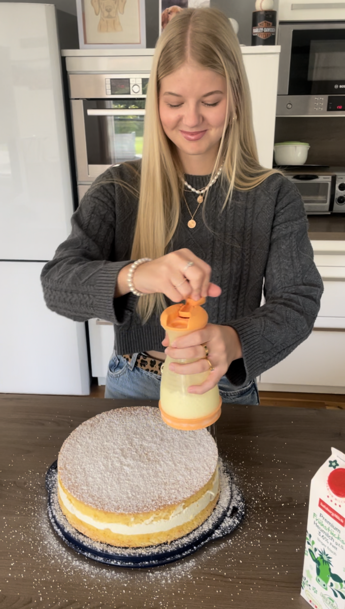 Wenn du mit den aufgezählten Schritten fertig bist, kannst du die Torte mit der Füllung bestreichen und für 6 Stunden in den Kühlschrank stellen. Jetzt fragst du dich bestimmt, warum du diese nicht gleich essen kannst, ich verrate es dir: Wenn du den Kuchen direkt nach dem Backen mit der Füllung befüllst, könnte es sein, dass dir der Kuchen auseinanderfällt.