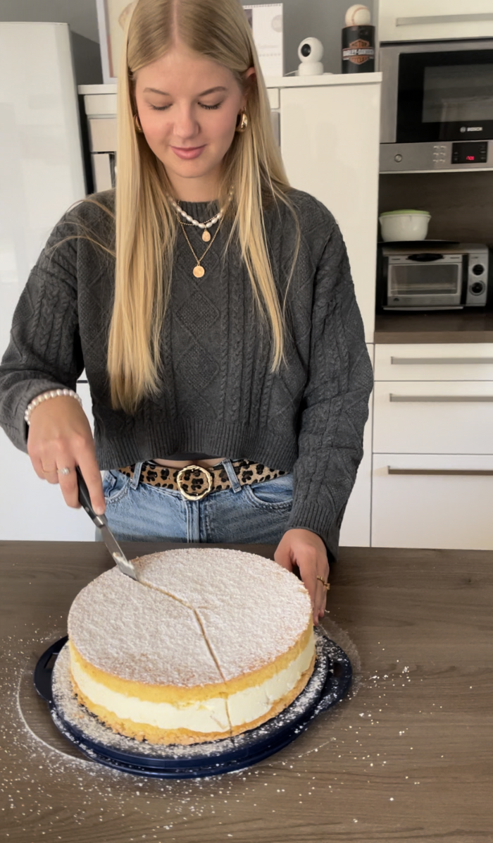 Anschließend die Form mit der Butter einfetten, den Teig in die Form geben und glattstreichen. Den Biskuitteig im vorgeheizten Ofen ca. 45 Minuten goldbraun backen. Alle Naschkatzen aufgepasst! - Jetzt folgt der beste Part. Bevor du die Schüssel abwäschst, kannst du die Reste rauskratzen und probieren, schließlich ist es als Bäcker wichtig, seine Kreationen vorab zu probieren. Nach dem Backen noch in der Form komplett auskühlen lassen, dann aus der Backform rausgeben und mit einem großen Messer einmal waagerecht durchschneiden.