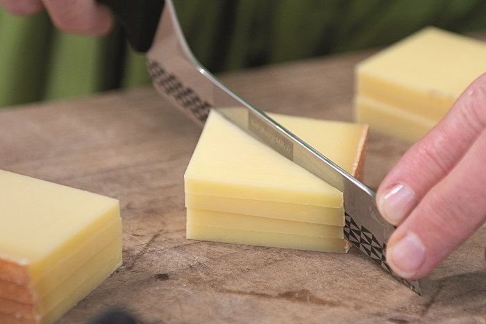Beim sogenannten "Dicklegen" der Milch werden Lab und/oder Milchsäurebakterien zugegeben. Dadurch entsteht die Gallerte – eine puddingähnliche Masse – welche anschließend mittels einer Käseharfe in kleinere oder größere Stücke, den sogenannten Käse-Bruch geschnitten wird. Durch diesen Prozess trennt sich das Milcheiweiß samt dem Fett von der Molke. Schon gewusst? Je kleiner die Stücke des Bruchs, umso fester wird später der Käse!