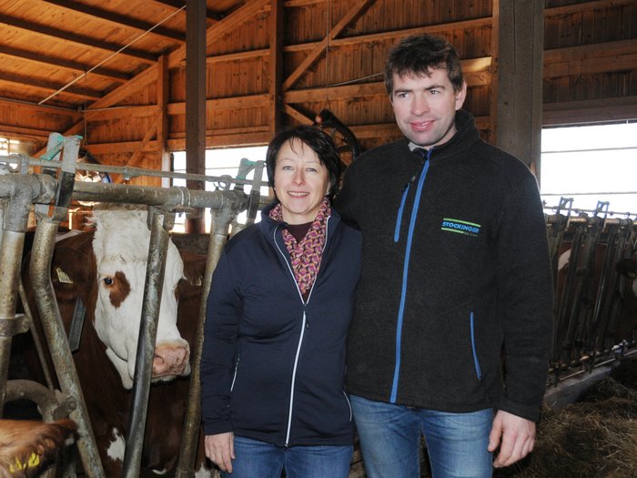 Ja, wir sind ein Familienbetrieb. Mein Mann macht hauptsächlich die Fütterung und alles rundherum. Wir machen gemeinsam alles sauber und schauen, dass es jedem Tier gut geht, dass die Liegeboxen sauber sind, dass frisch eingestreut wird. Wir betreuen die Kälber gemeinsam. Es ist auch sehr viel administrative Arbeit zu tun, das mache dann meistens ich. Die Reparaturen von den Maschinen macht mein Mann – es ist immer irgendetwas zum Herrichten, weil bei so vielen Maschinen immer irgendwie etwas kaputt ist. Aber es ist die klassische Aufteilung – die schwereren Aufgaben macht der Mann, die leichteren die Frau, das ist einfach körperlich so vorgegeben.